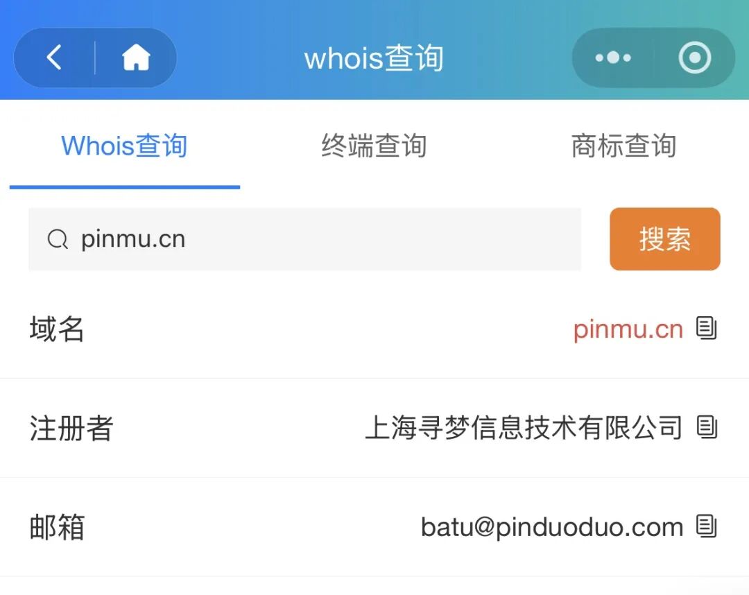 不仅如此,与“新拼姆”高度匹配的pinmu.com也在3月29日发生Whois信息变更,业内人士普遍认为,该域名同样极有可能已被拼多多收入囊中。