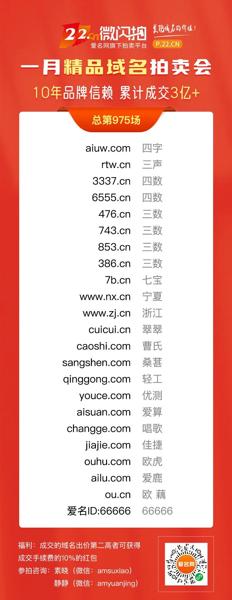 爱名网旗下域名拍卖平台——微闪拍(P.22.CN)每周二/四晚 19:30准时开拍!本周四晚(1.29) ,微闪拍(总第975)域名拍卖清单如下: